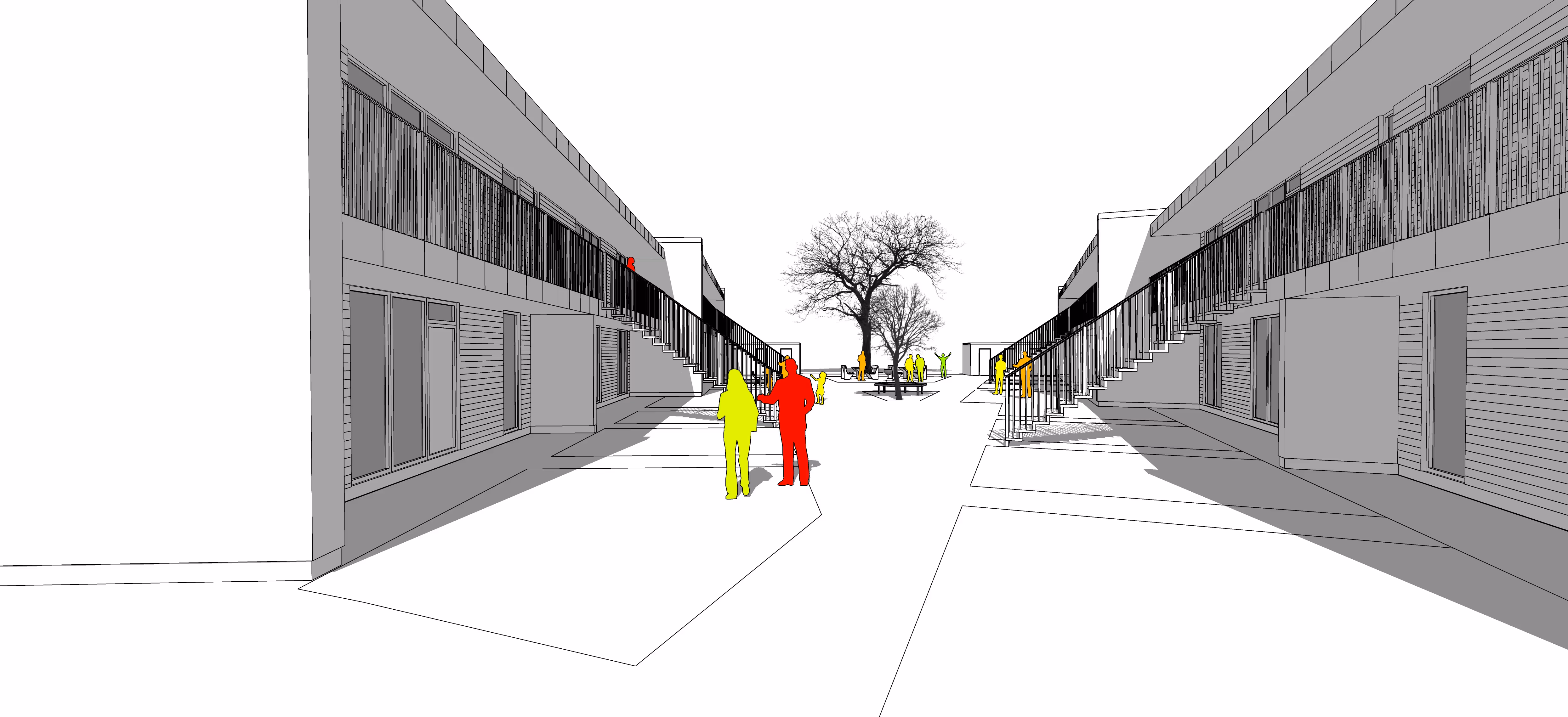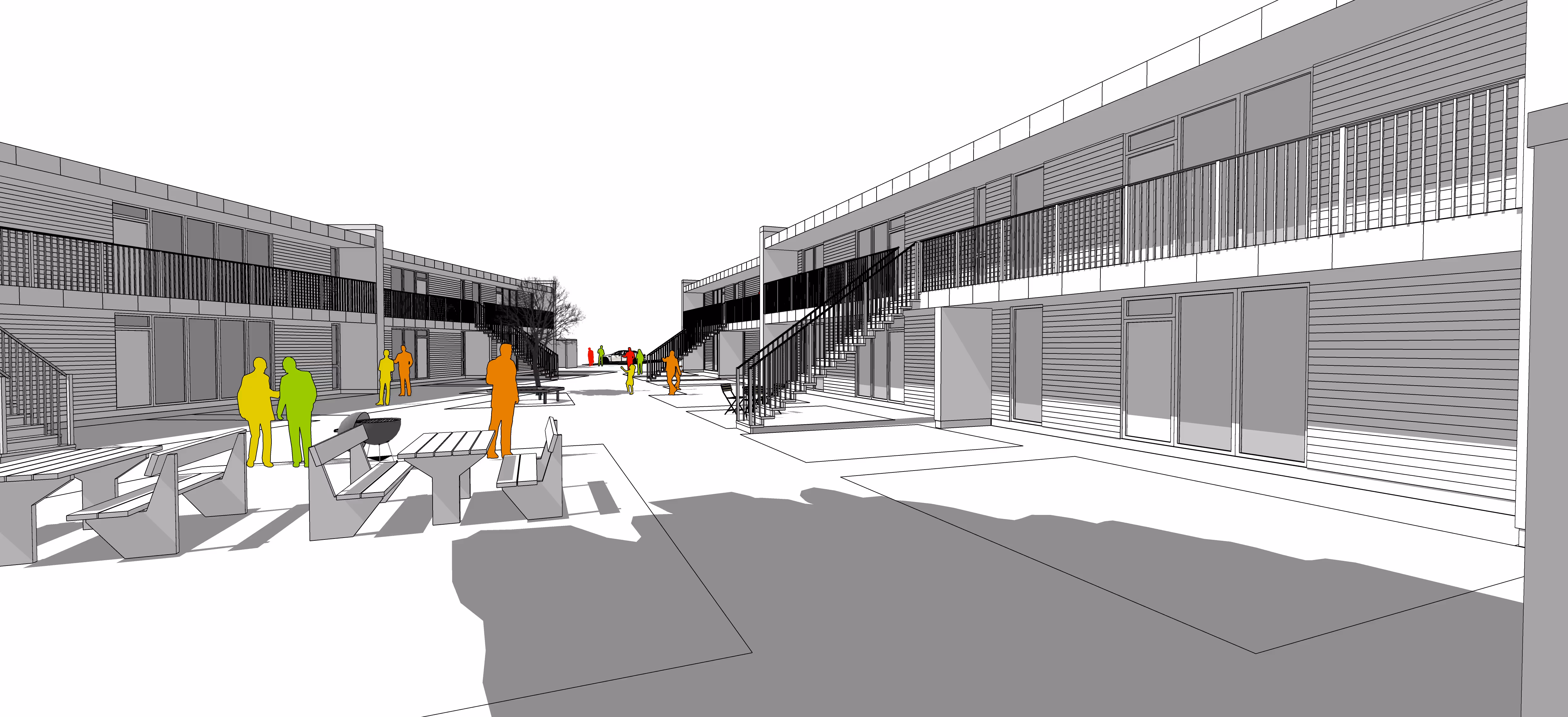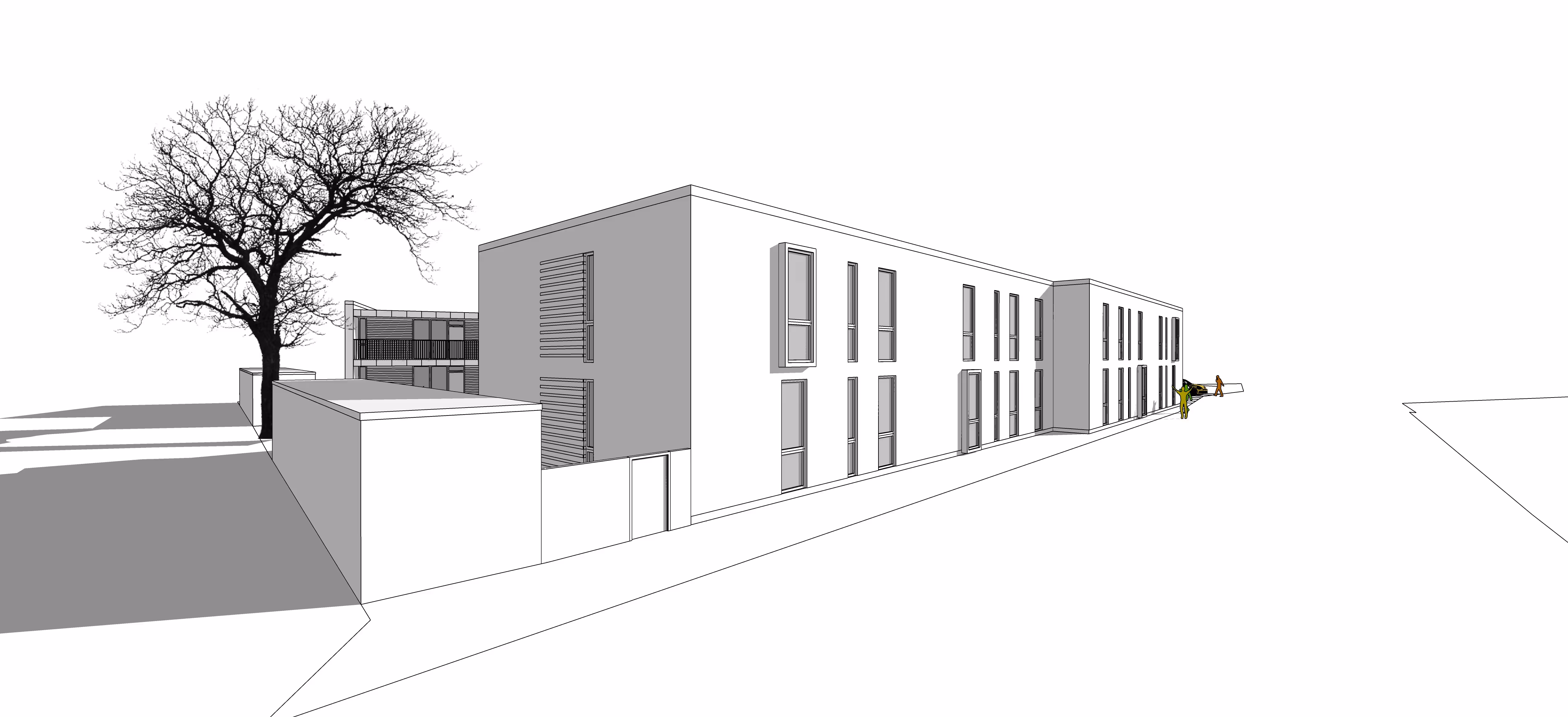 Skitserne er udarbejdet på baggrund af bygherrens ønske om at opføre 16 boliger fordelt på to selvstændige bygninger, hver med to etager. Projektet omfatter tre forskellige lejlighedsstørrelser: 3-værelses og 4-værelses, med arealer på 79, 98 og 120 m². Alle boliger er indrettet med en åben og fleksibel planløsning, hvor de primære opholdsrum har store vinduespartier mod gårdrummet, hvilket skaber en god forbindelse til udendørsarealerne. De store vinduer sikrer et godt og indbydende lysindfald, der bidrager til et behageligt indeklima. Bygherren har ønsket at skabe moderne boliger med tidssvarende arkitektur, som både passer godt ind i lokalområdet og samtidig bidrager til at løfte området og skabe nyt liv. Bygningerne vil blive opført i blankt murværk af grå sten med en mørk nuance, hvilket giver facaderne et varieret og æstetisk udtryk. Facaden mod gårdrummet vil være udført med en vandret, let beklædning. Det er vigtigt at understrege, at udearealerne mellem bygningerne er planlagt som opholdsrum for beboerne. Det grønne område i midten vil skabe ideelle muligheder for leg og socialt samvær, og vil være et værdifuldt rum til både rekreation og fællesskab for beboerne.