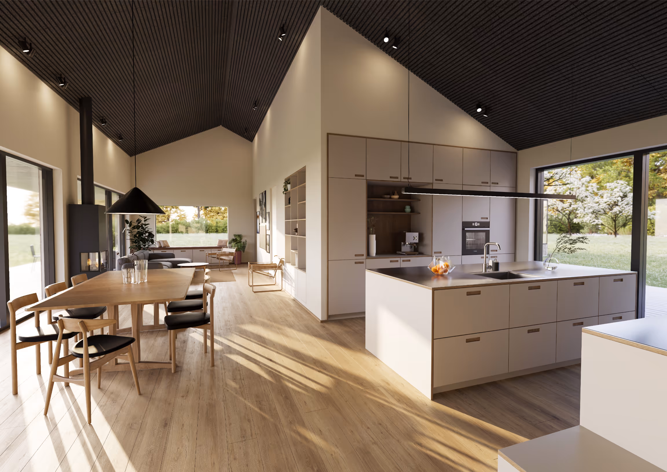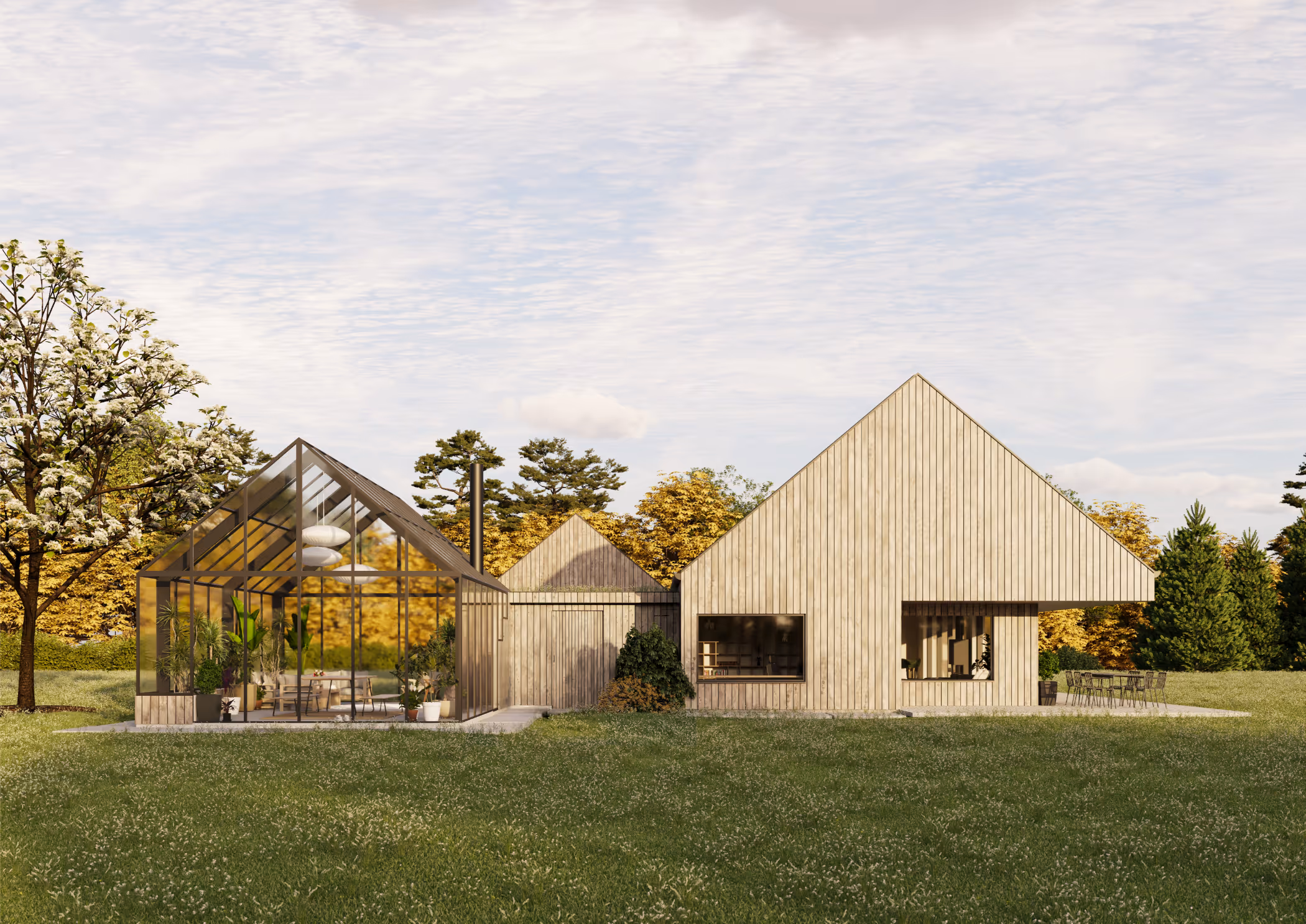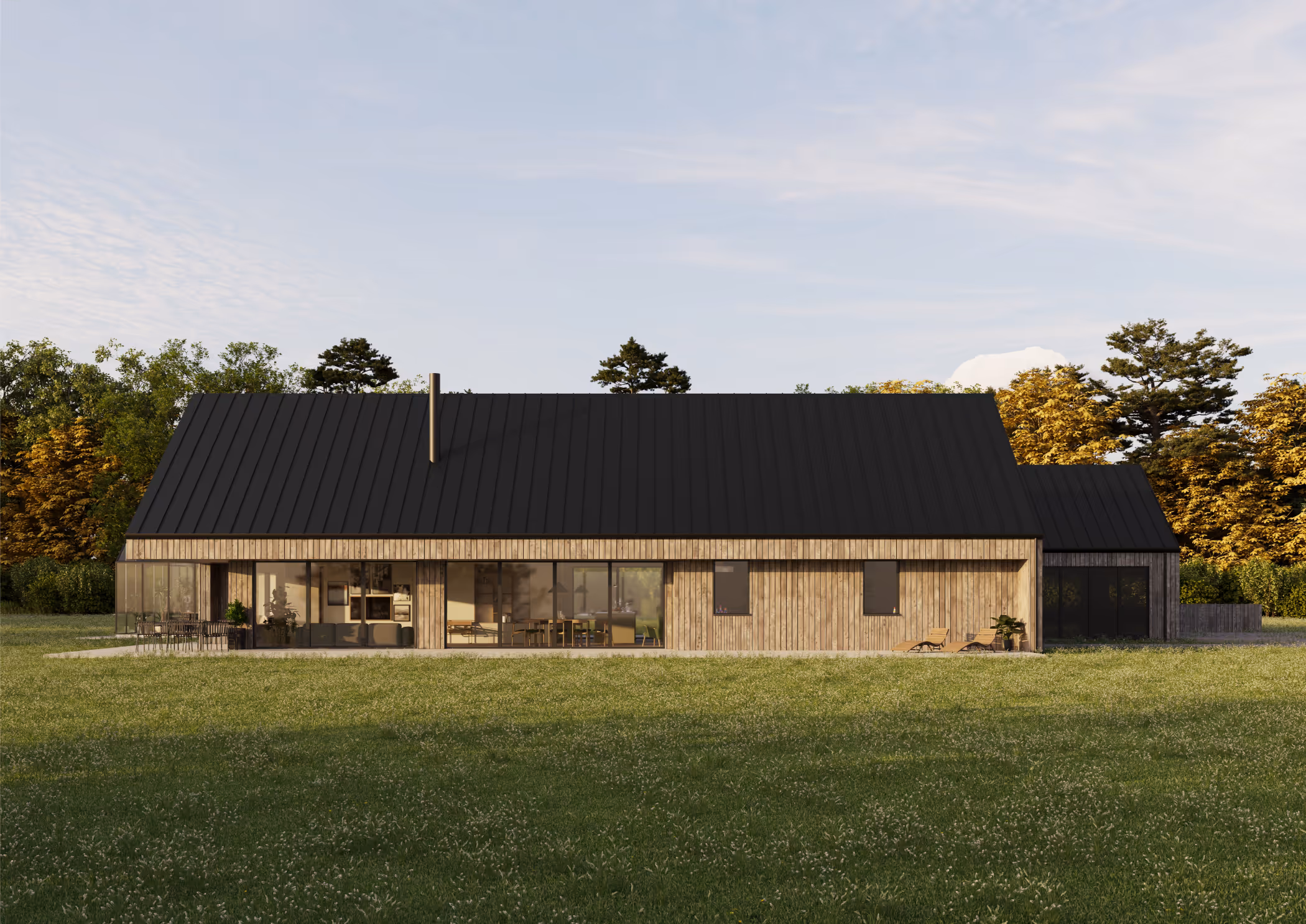 Det nye landhus skal være beliggende i den naturskønne omegn ved Tommerup på Fyn. Designet som et moderne længehus kombinerer det tidløse arkitektoniske udtryk med bæredygtighed. Den udvendige beklædning udføres i Abodo, et termobehandlet newzealandsk fyrretræ, der er næsten knastfrit og kendetegnet ved sin levende åretegning og varme farve. Over tid patinerer træet naturligt til en elegant sølvgrå nuance, der harmonerer med omgivelserne. Husets primære opholdsrum er strategisk placeret mod nord, syd og vest for at maksimere udsigten over de omkringliggende marker og den frodige natur. Udenfor er der etableret fleksible opholdszoner, som gør det muligt at følge solens bane og nyde dagens skiftende lys og stemning. Et orangeri tilføjer ekstra værdi til huset og skaber en hyggelig oase, hvor man kan opholde sig komfortabelt selv i årets køligere måneder. Husets design prioriterer lange, harmoniske kig både på langs og tværs af boligen, hvilket giver en følelse af rummelighed og forbindelse til den omkringliggende natur.