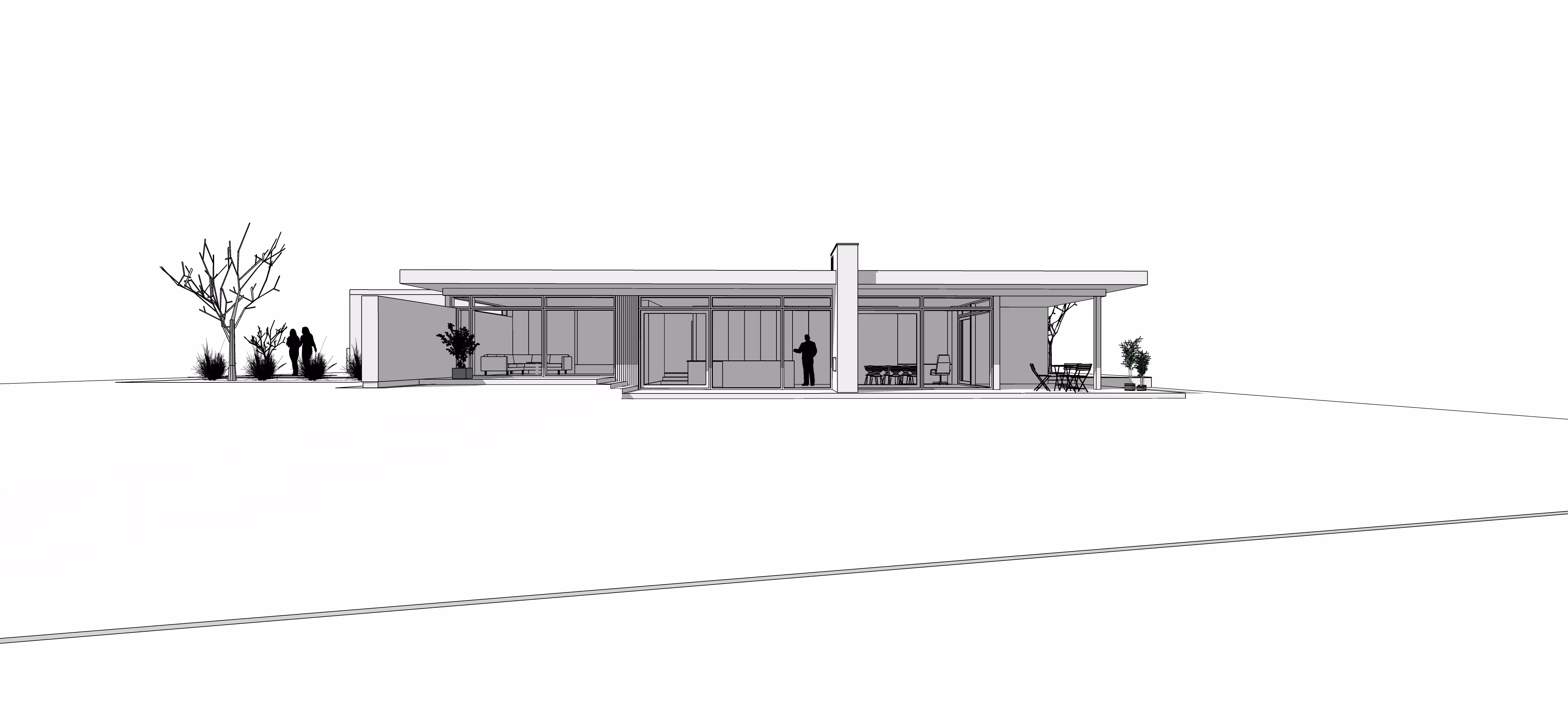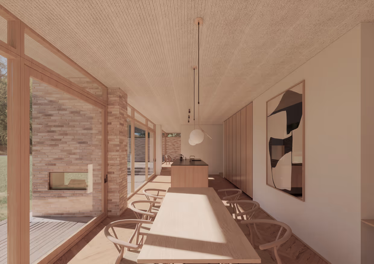 Skitser af nyt enfamiliehus beliggende i Ringe på Midtfyn. Huset opføres i gennemførte og smukke materialer som passer ind i konteksten for området.